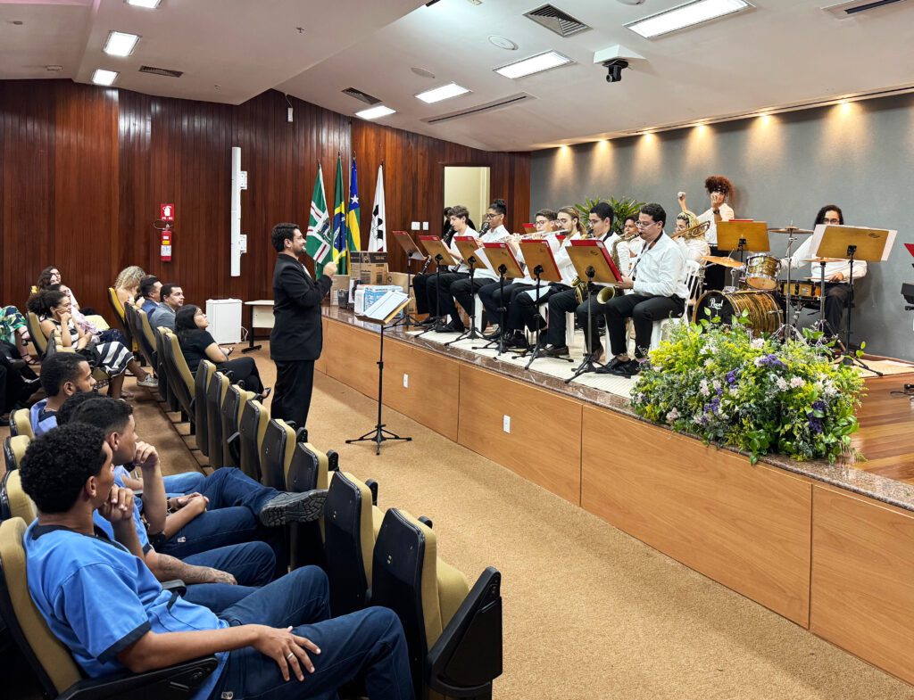 O último dia da 19ª Semana do MPGO movimentou o auditório do edifício-sede, em Goiânia, nesta sexta-feira (12/12). O evento contou com a apresentação de parte da Orquestra Sinfônica Jovem de Goiás. Sob a regência do maestro Gustavo Luiz Aprigio, os(as) integrantes desfrutaram de músicas tradicionais natalinas, além de animadas releituras de clássicos da música sertaneja.