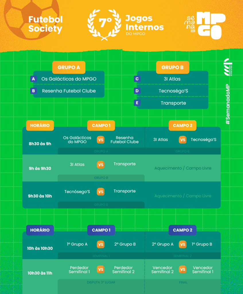 A competição de Futebol Society contará com cinco equipes divididas em dois grupos. As partidas começam às 8h30, com Os Galácticos do MPGO x Resenha Futebol Clube no Campo 1 e 3I Atlas x Tecnoségo’S no Campo 2. Às 9h, jogam 3I Atlas x Transporte, e às 9h30, Tecnoségo’S x Transporte, encerrando a fase de grupos. As semifinais estão marcadas para às 10h, enquanto a final e a disputa do 3º lugar ocorrem às 10h30, encerrando a competição.
